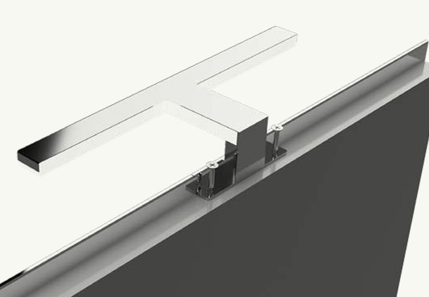 The “dual” fixing bracket allows installation on both the profile and the edge of the mirror, ensuring stability and ease of assembly.